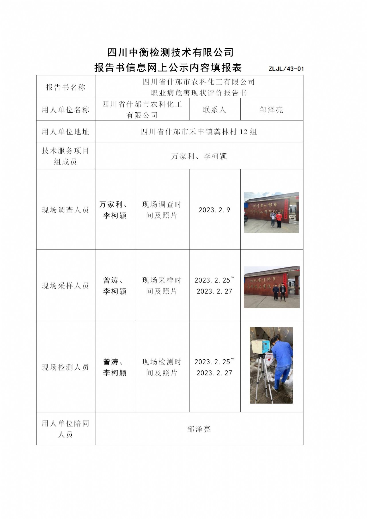 四川省什邡市農(nóng)科化工有限公司 職業(yè)病危害現(xiàn)狀評價
