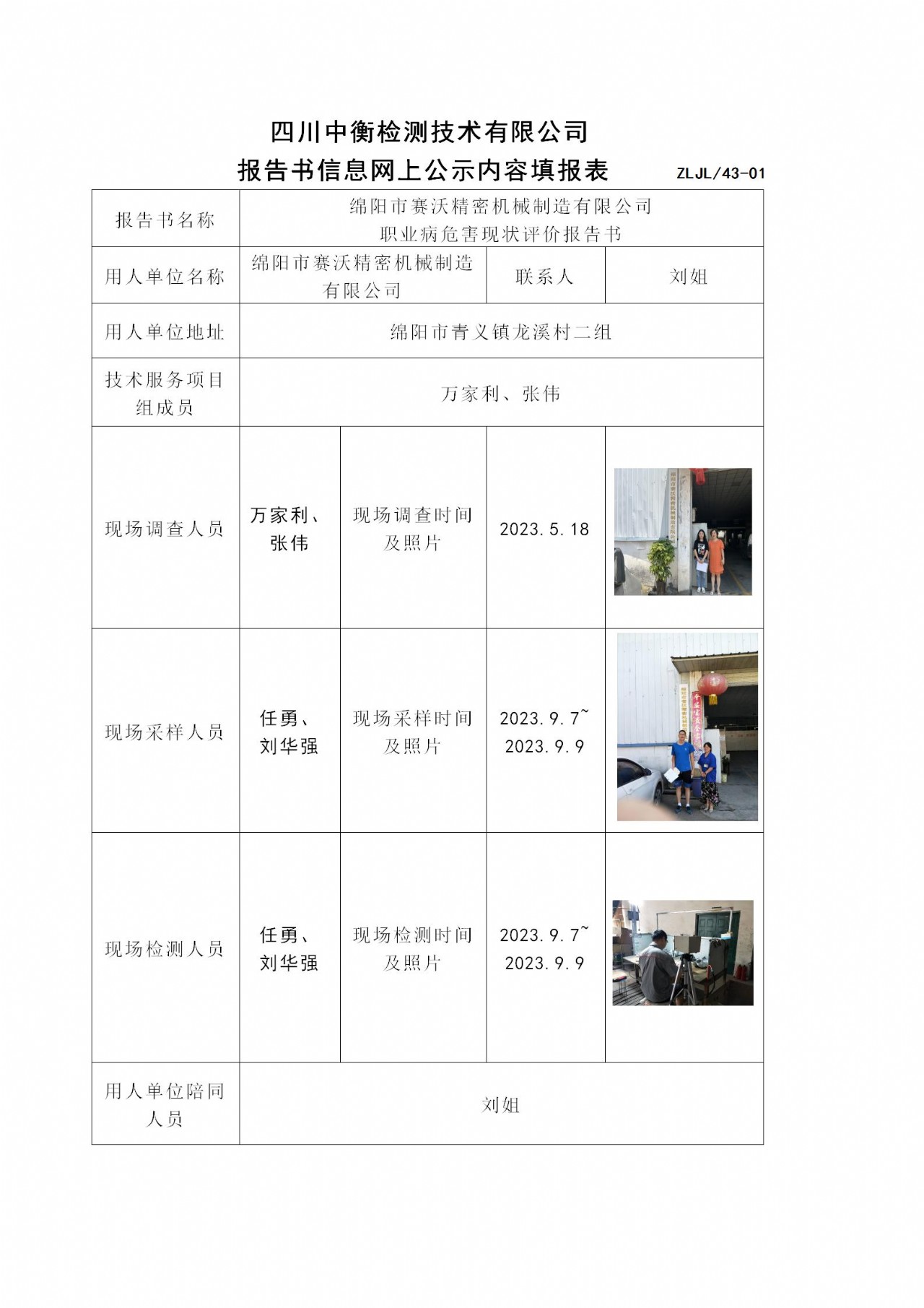 綿陽市賽沃精密機械制造有限公司 職業(yè)病危害現(xiàn)狀評價