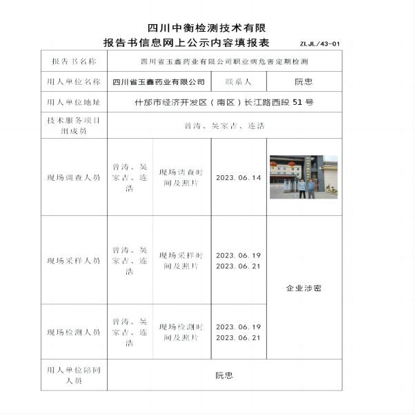 四川省玉鑫藥業(yè)有限公司定期檢測