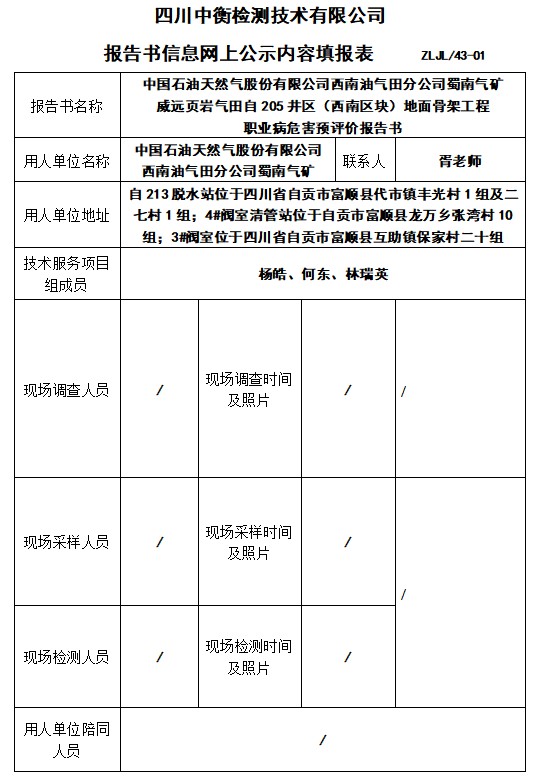 中國(guó)石油天然氣股份有限公司西南油氣田分公司蜀南氣礦 威遠(yuǎn)頁(yè)巖氣田自205井區(qū)(西南區(qū)塊)地面骨架工程 職業(yè)病危害預(yù)評(píng)價(jià)報(bào)告書(shū)