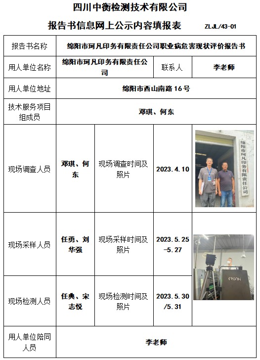 綿陽市珂凡印務有限責任公司職業(yè)病危害現(xiàn)狀評價報告書
