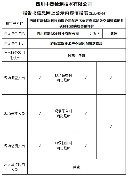 四川虹新制冷科技有限公司年產(chǎn)720萬套高能效空調(diào)管路配件項目職業(yè)病危害預(yù)評價