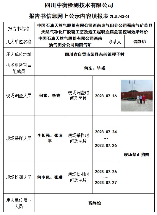 中國石油天然氣股份有限公司西南油氣田分公司蜀南氣礦榮縣天然氣凈化廠脫硫工藝改造工程職業(yè)病危害控制效果評價(jià)