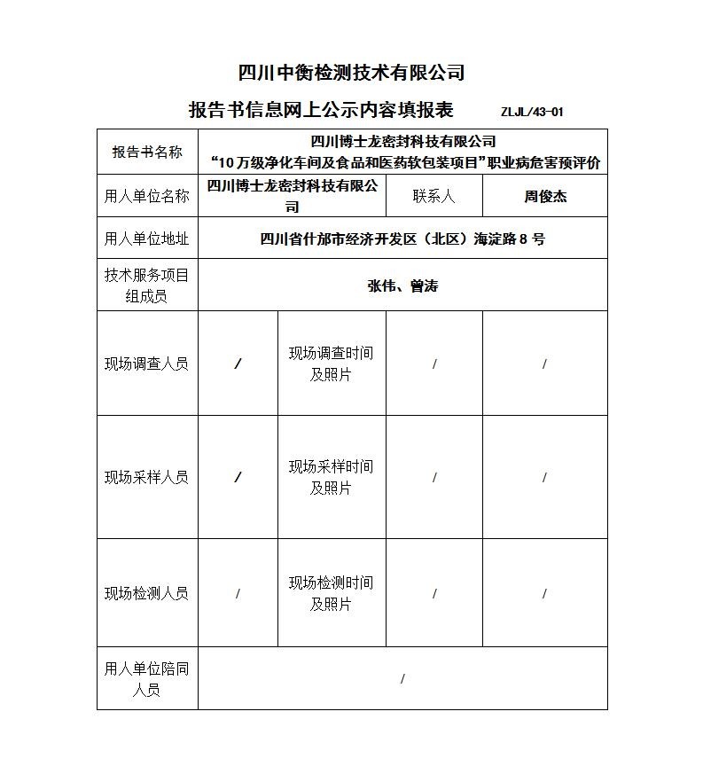 四川博士龍密封科技有限公司“10萬級凈化車間及食品和醫(yī)藥軟包裝項(xiàng)目” 職業(yè)病危害預(yù)評價(jià)