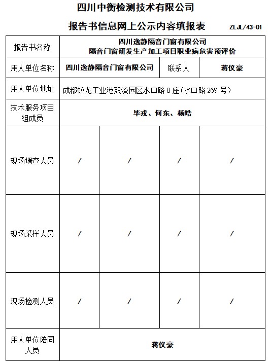 四川逸靜隔音門窗有限公司 隔音門窗研發(fā)生產(chǎn)加工項目職業(yè)病危害預(yù)評價