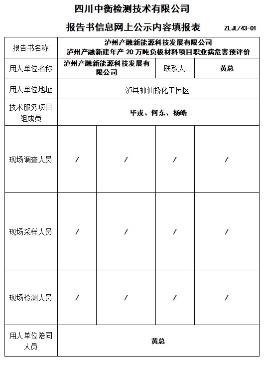 瀘州產(chǎn)融新能源科技發(fā)展有限公司 瀘州產(chǎn)融新建年產(chǎn)20萬(wàn)噸負(fù)極材料項(xiàng)目職業(yè)病危害預(yù)評(píng)價(jià)