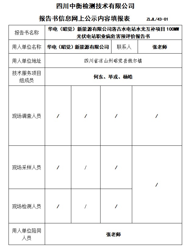 華電(昭覺)新能源有限公司洛古水電站水光互補項目100MW光伏電站職業(yè)病危害預(yù)評價報告書