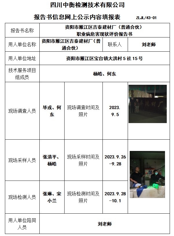 資陽(yáng)市雁江區(qū)吉泰建材廠(普通合伙) 職業(yè)病危害現(xiàn)狀評(píng)價(jià)報(bào)告書(shū)