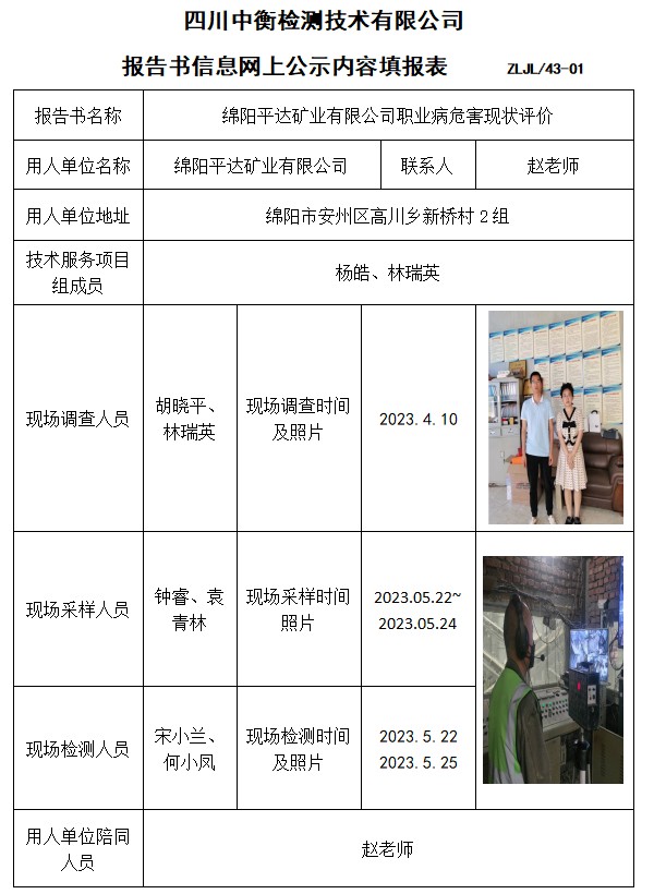 綿陽平達(dá)礦業(yè)有限公司職業(yè)病危害現(xiàn)狀評價