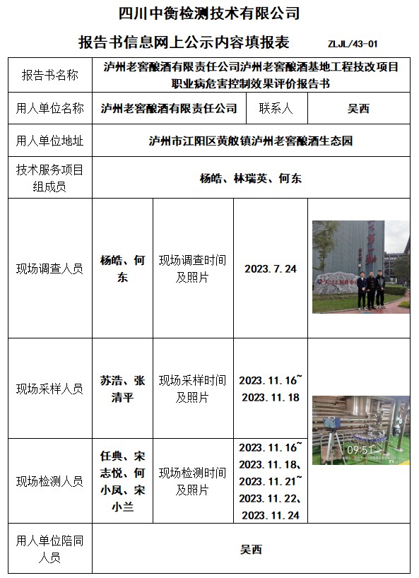 瀘州老窖釀酒有限責(zé)任公司瀘州老窖釀酒基地工程技改項目 職業(yè)病危害控制效果評價報告書