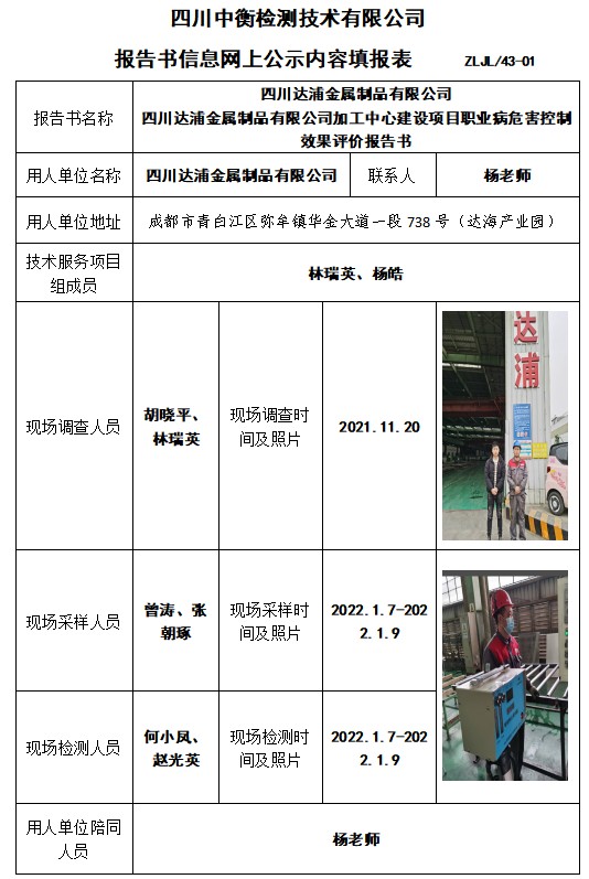 四川達(dá)浦金屬制品有限公司 四川達(dá)浦金屬制品有限公司加工中心建設(shè)項目職業(yè)病危害控制效果評價報告書