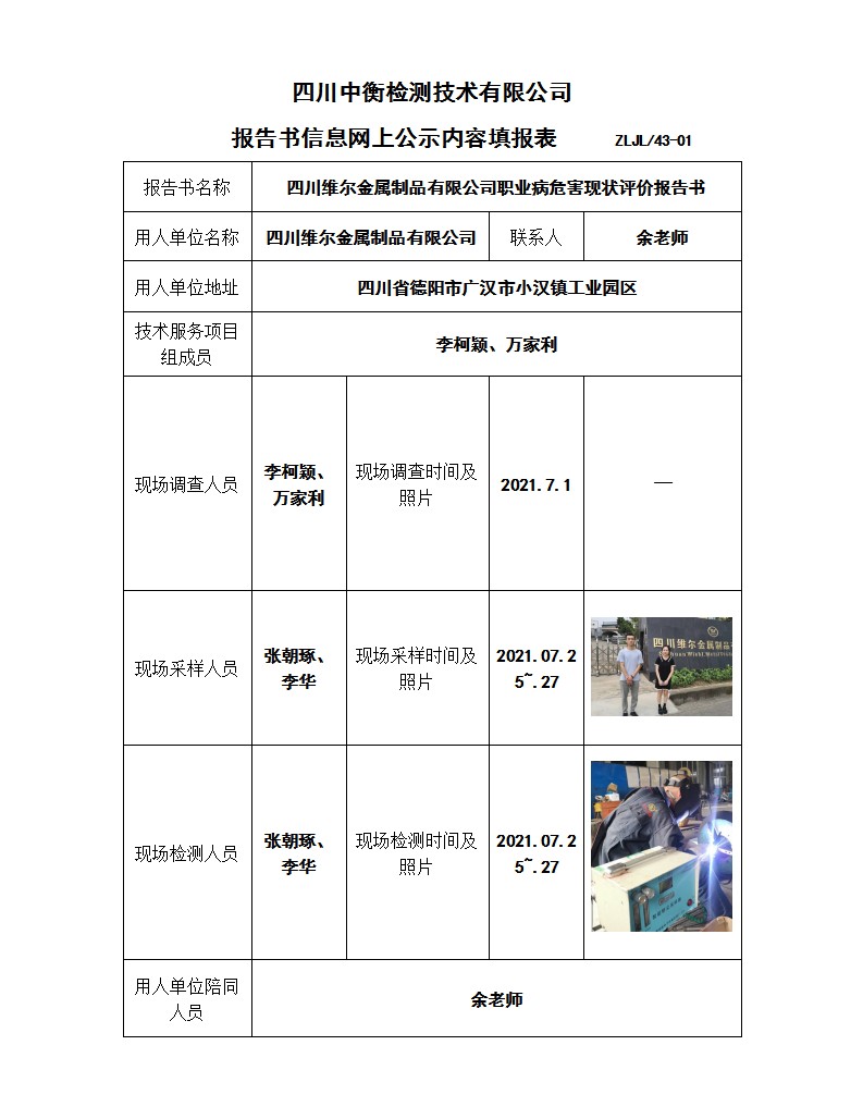 四川維爾金屬制品有限公司 職業(yè)病危害現(xiàn)狀評價報告書
