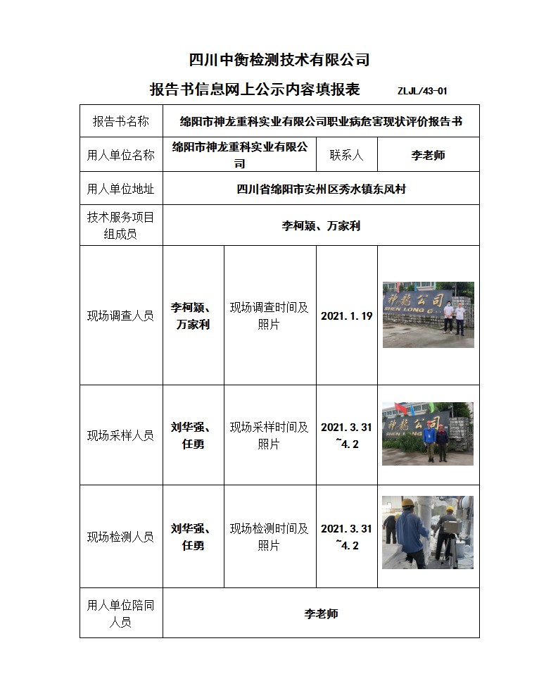 綿陽市神龍重科實業(yè)有限公司職業(yè)病危害現(xiàn)狀評價
