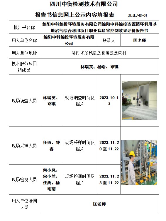 綿陽中科綿投環(huán)境服務(wù)有限公司綿陽中科綿投資源循環(huán)利用基地沼氣綜合利用項(xiàng)目職業(yè)病危害控制效果評價(jià)報(bào)告書