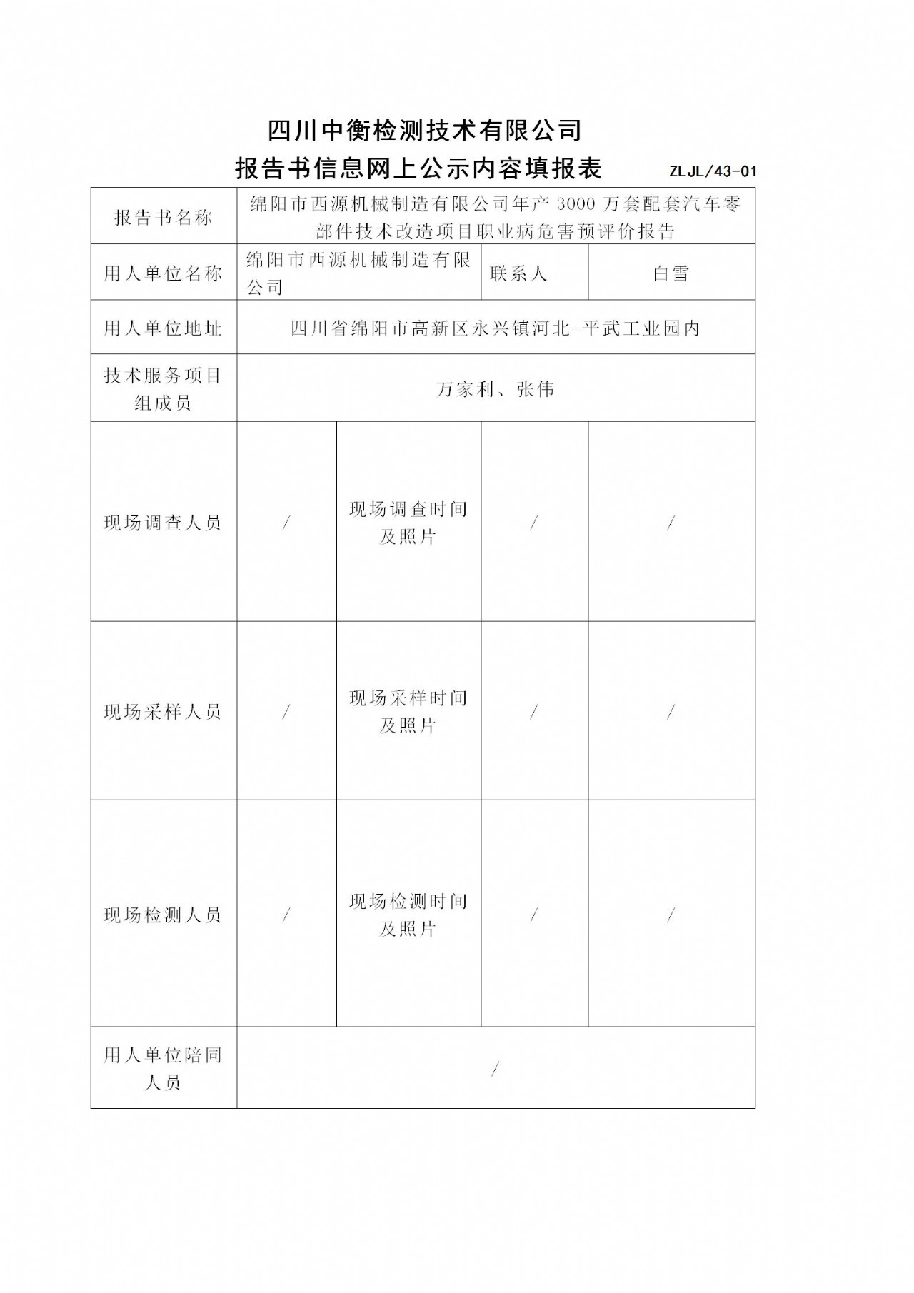 綿陽市西源機(jī)械制造有限公司年產(chǎn)3000萬套配套汽車零部件技術(shù)改造項(xiàng)目職業(yè)病危害預(yù)評價