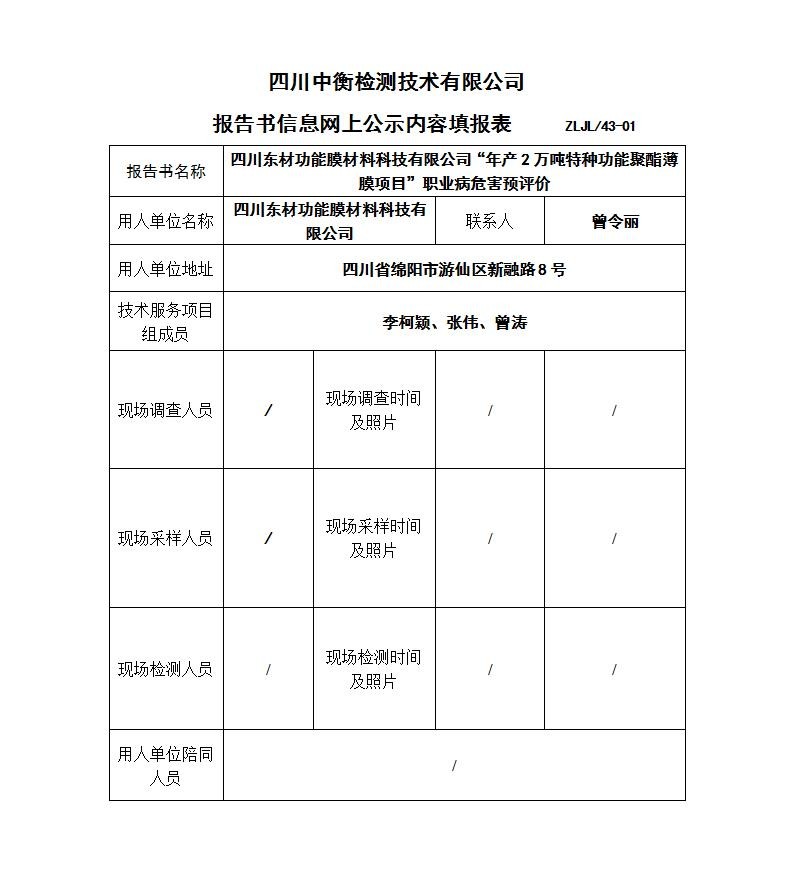 四川東材功能膜材料科技有限公司“年產(chǎn)2萬噸特種功能聚酯薄膜項(xiàng)目”職業(yè)病危害預(yù)評(píng)價(jià)