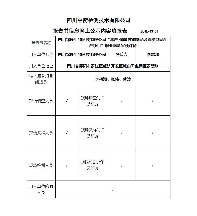 四川錦匠生物科技有限公司“年產(chǎn)4000噸調(diào)味品及肉類(lèi)制品生產(chǎn)項(xiàng)目”職業(yè)病危害預(yù)評(píng)價(jià)