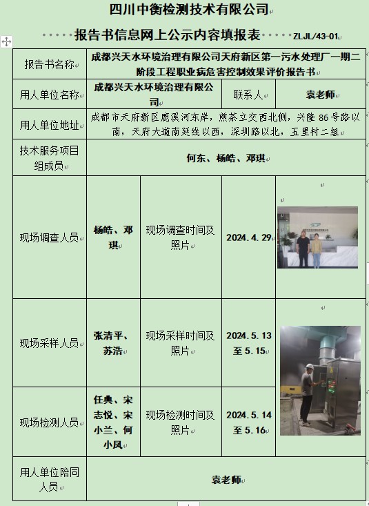 成都興天水環(huán)境治理有限公司天府新區(qū)第一污水處理廠一期二階段工程職業(yè)病危害控制效果評價報告書