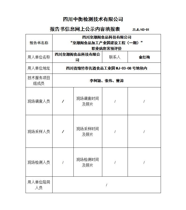 四川皇潮閣食品科技有限公司“皇潮閣食品加工產(chǎn)業(yè)園建設(shè)工程(一期)”職業(yè)病危害預(yù)評價