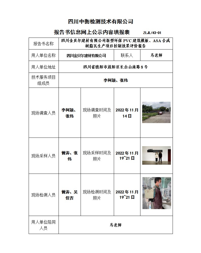 四川金貝爾建材有限公司 新型環(huán)保PVC建筑模板、ASA合成樹脂瓦生產項目 職業(yè)病危害控制效果評價報告書