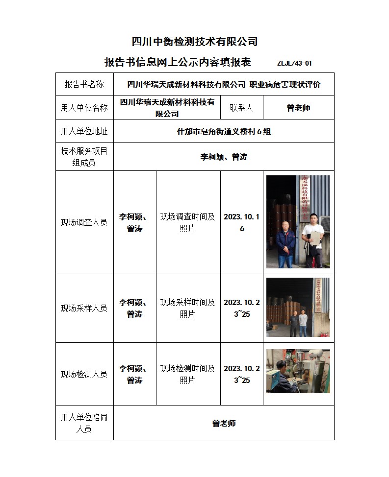四川華瑞天成新材料科技有限公司 職業(yè)病危害現(xiàn)狀評價報告書