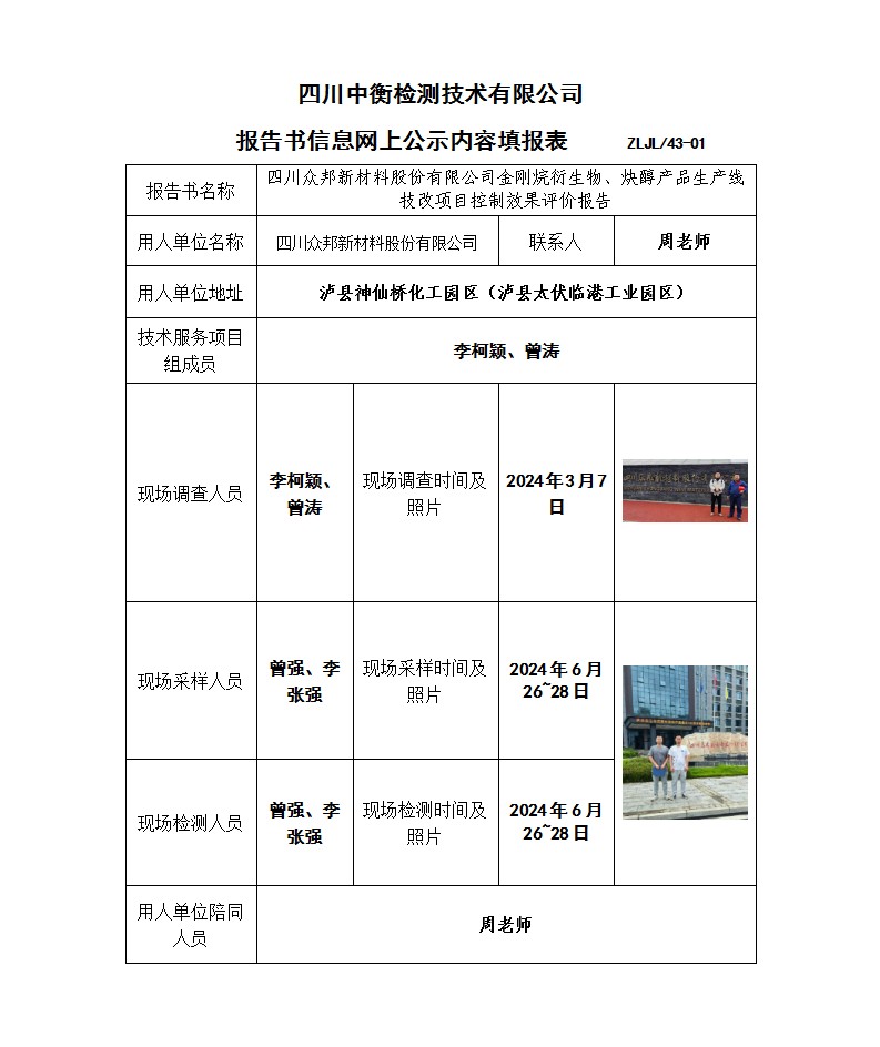 四川眾邦新材料股份有限公司 金剛烷衍生物、炔醇產(chǎn)品生產(chǎn)線技改項目 職業(yè)病危害控制效果評價報告書